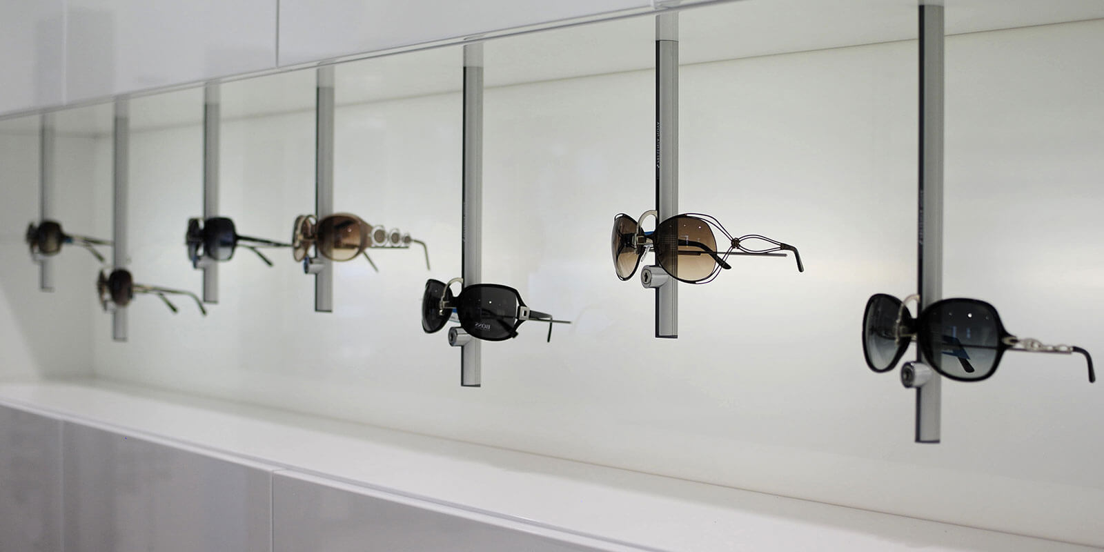 10 unique eyewear displaying systems for walls. From lockable frame display rods, and simple bars with pins up to lockable frame holders and shelves. Simple installation onto any type of surface.